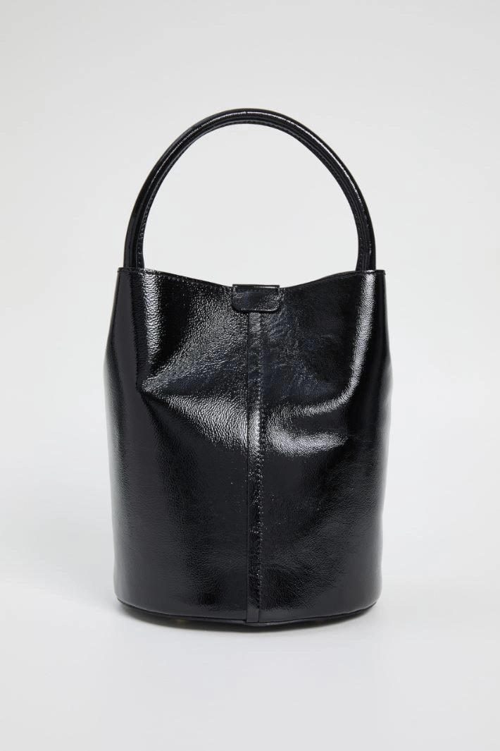 Bucket bag in genuine leather with a patent finish, with a single tubular handle, adjustable and removable shoulder strap, and magnetic button closure.
