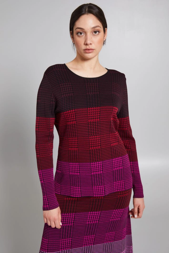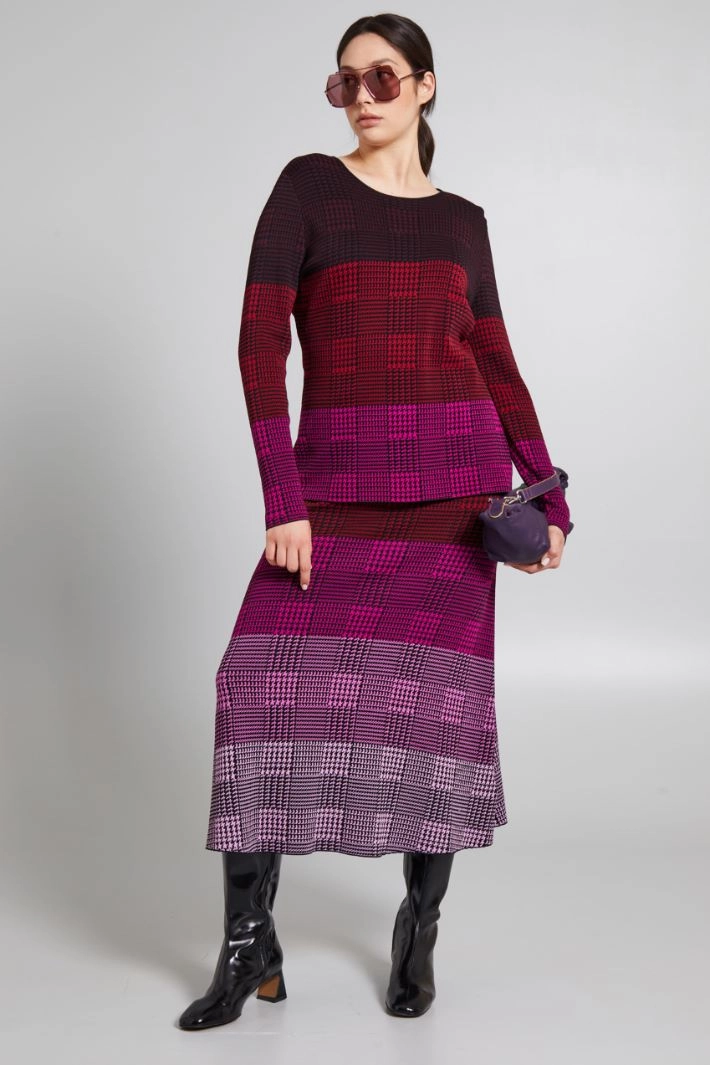 Fitted sweater in jacquard viscose blend yarn, with round neckline and long sleeves.