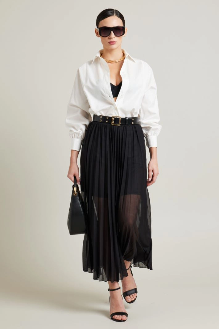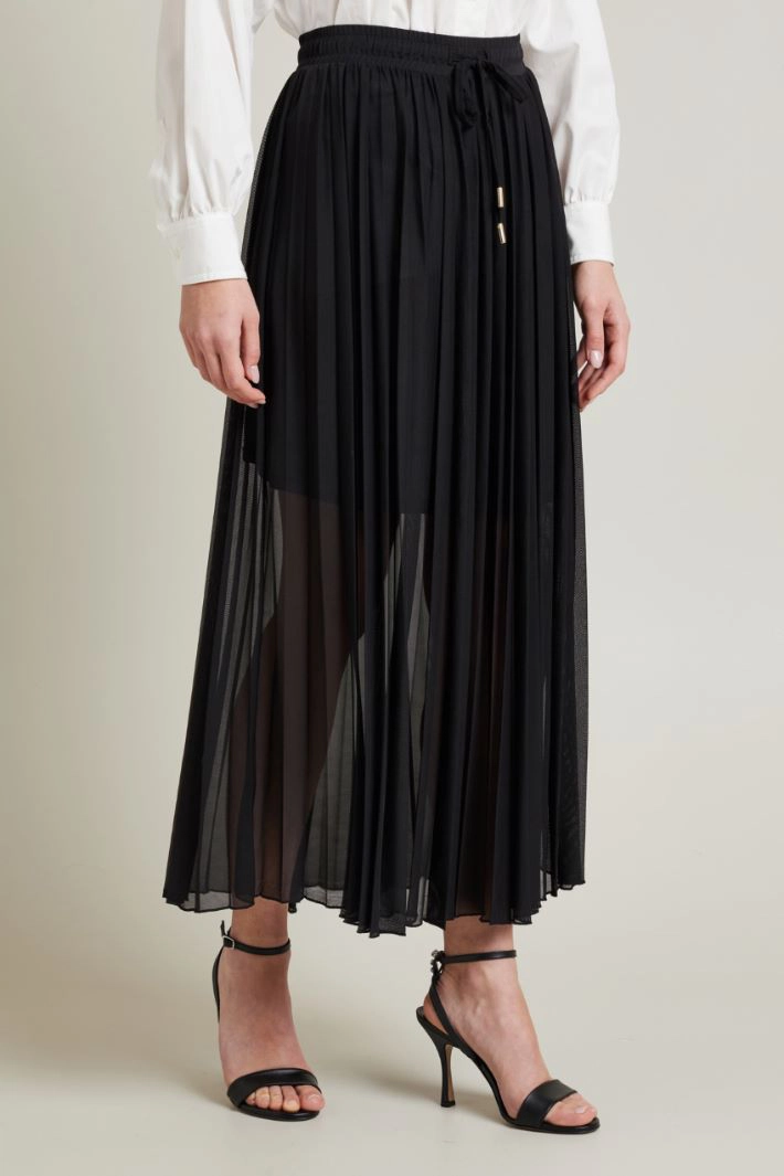Long flared skirt in stretch tulle jersey, with pleats and drawstring waist. Lined.