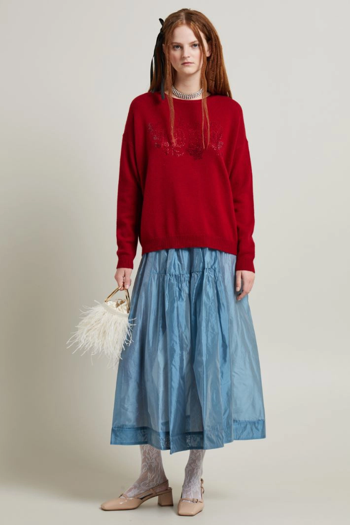 Long flared skirt in viscose-blend organza, with elastic waistband, inset side pockets and gathered front details. Removable cotton canvas underskirt in tone.