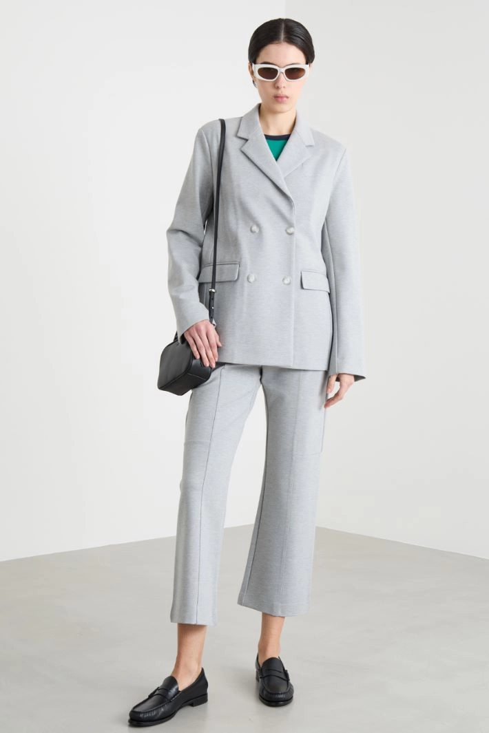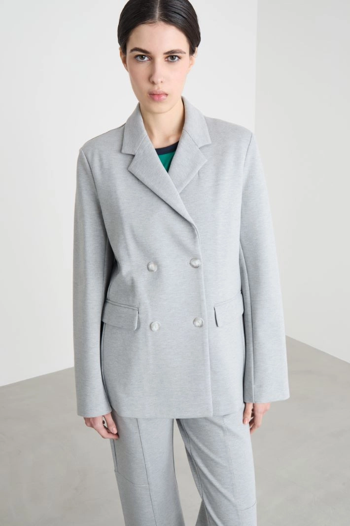 Relaxed-fit double-breasted blazer crafted in a viscose blend. This piece features a lapel collar, long sleeves, front flapped welt pockets, and a double-breasted button fastening.