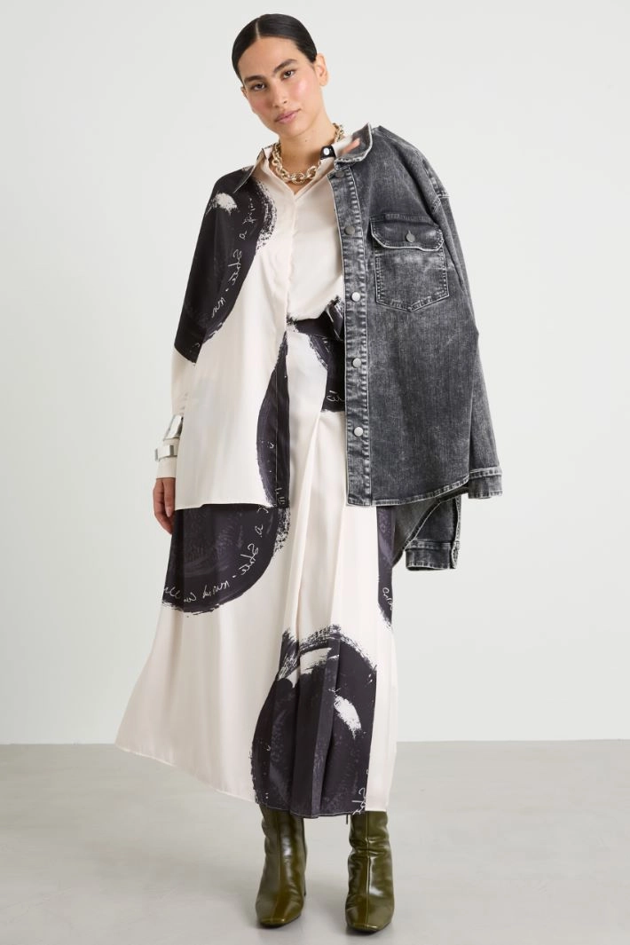 Slightly flared skirt in printed twill with side pleats on the front and back. Invisible zip fastening on the side. Lined.