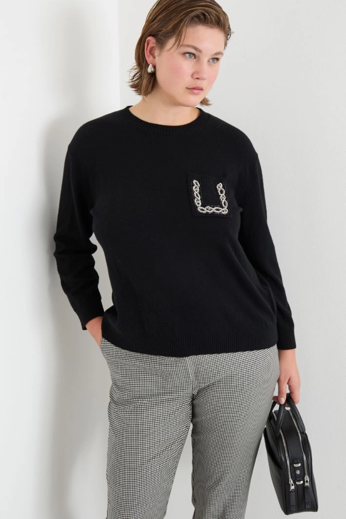 Straight-fit jumper in wool-blend yarn, with a round neck, long sleeves and a patch pocket embellished with rhinestones and crystals. Ribbed trims.