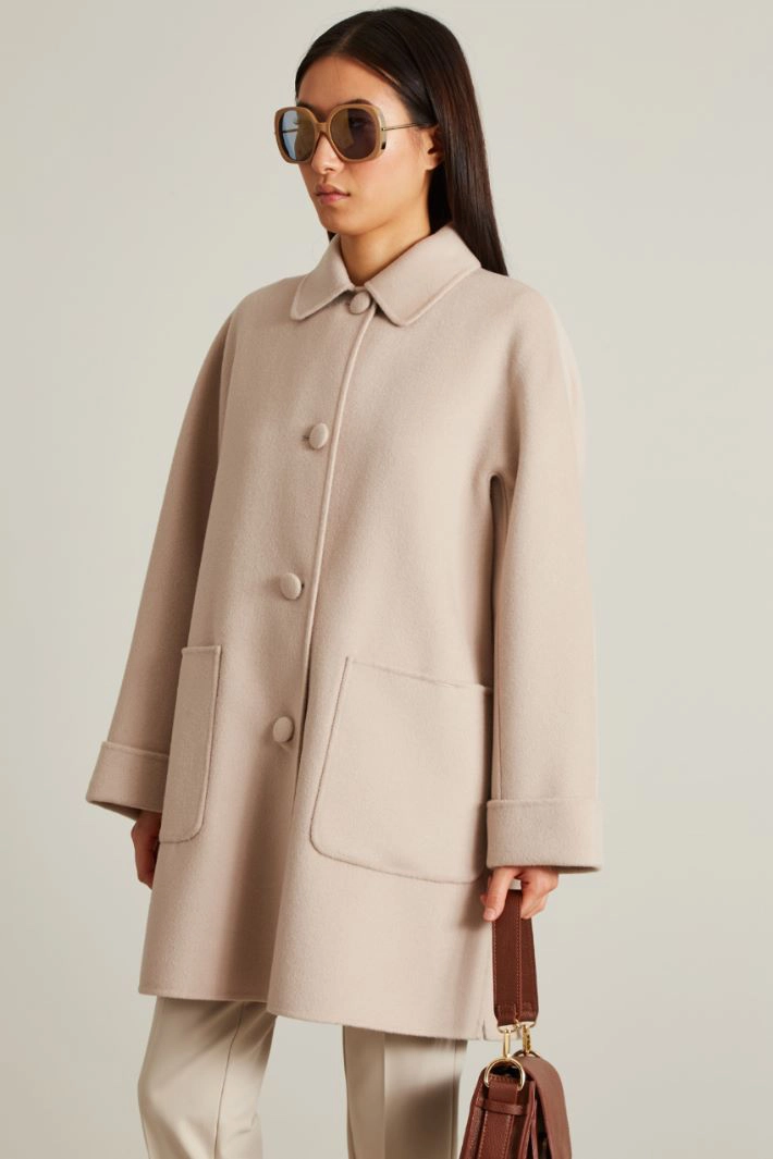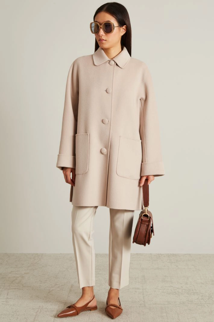 Straight-fit coat in double wool, with shirt collar, long raglan sleeves with cuffs, side patch pockets and single-breasted fastening with covered buttons. Unlined.