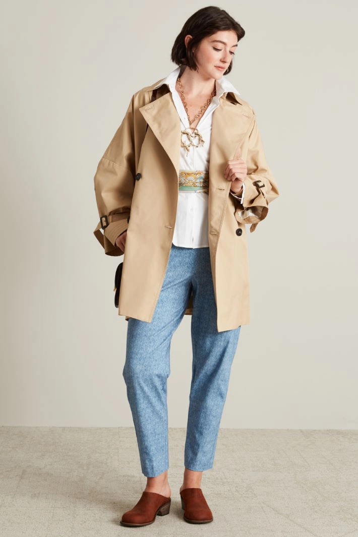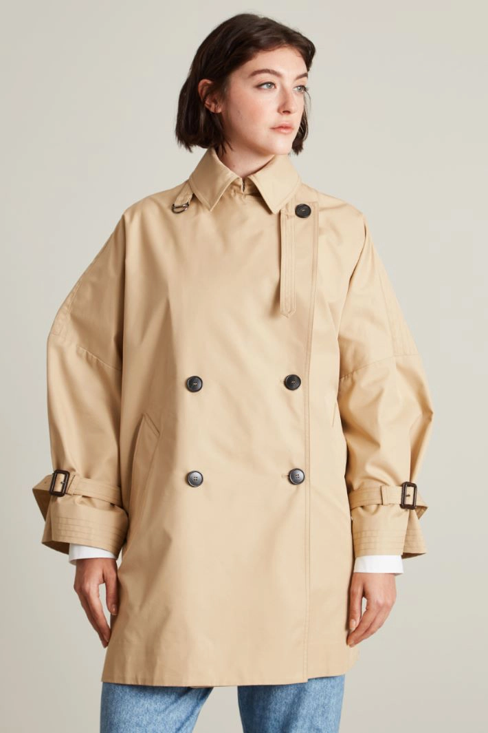 Loose-fit trench coat in stretch cotton-blend gabardine, with a lapel collar featuring a strap, long dropped sleeves with straps at the cuff, side welt pockets and double-breasted fastening with buttons. Partially-lined.