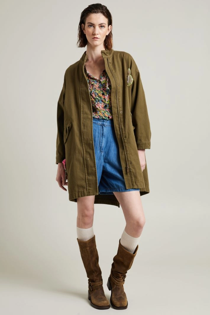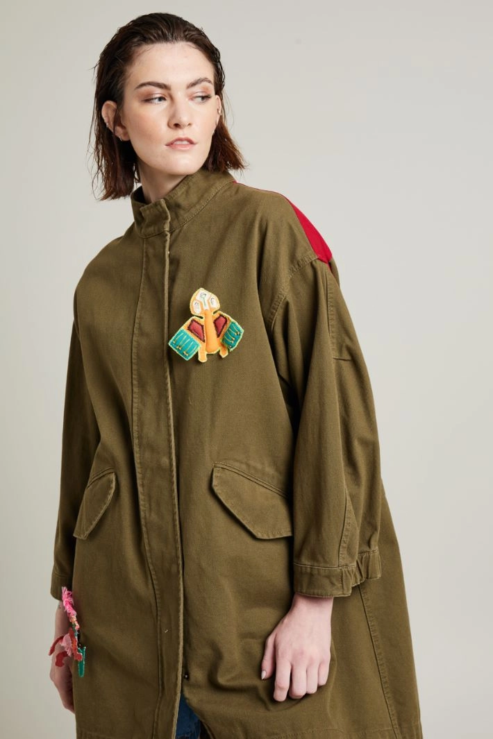 Oversized parka in pure cotton gabardine with stand-up collar, long dropped sleeves with adjustable cuffs with buttons, double welt pockets with flap on the front, zip fastening hidden by snap buttons. Central slit on the back, removable appliques on the front and insert with multicolor and three-dimensional detail on the back. Unlined.
