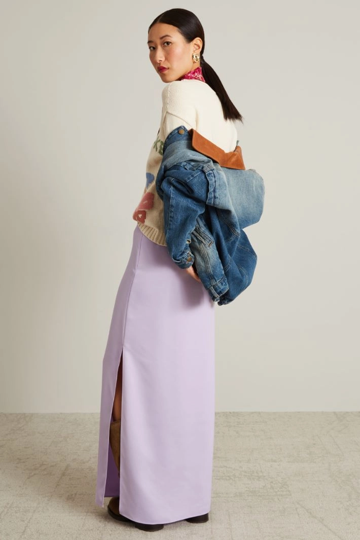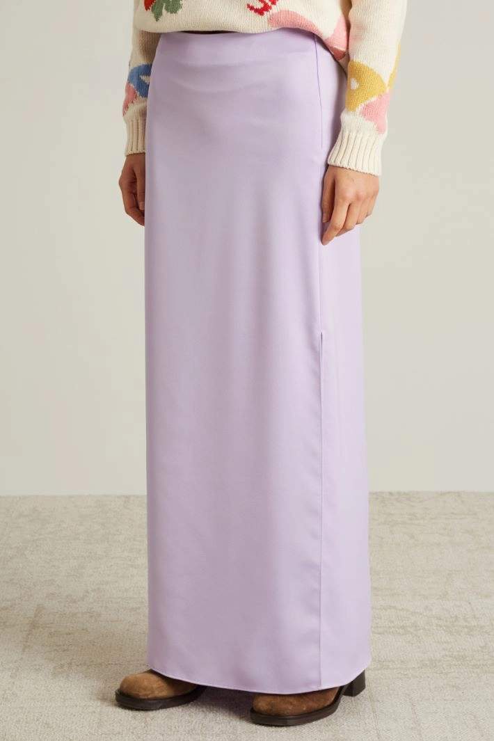 Long straight-fit skirt in envers satin with a shiny finish, with side slit and invisible zip fastening on the side.