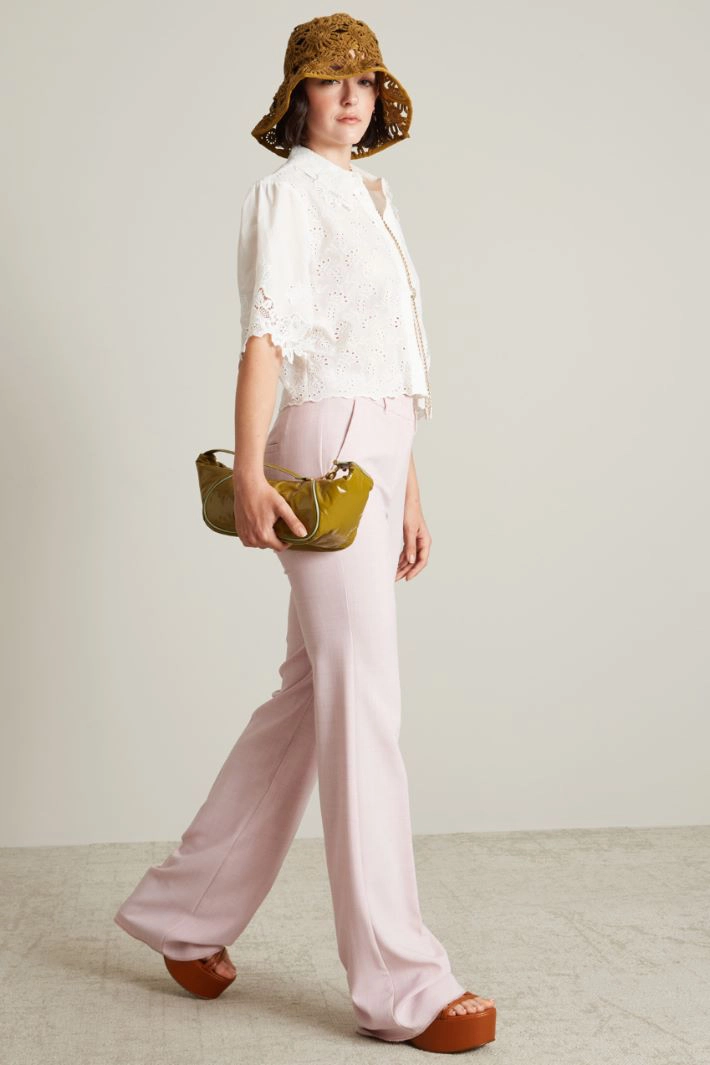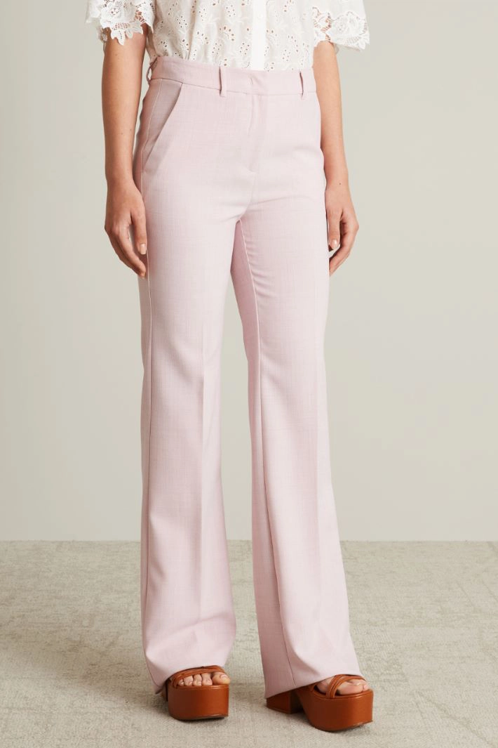 Straight-fit trousers in stretch canvas, with waistband, French pockets on the sides, crease along the length and hidden fastening with zip, button and hooks.