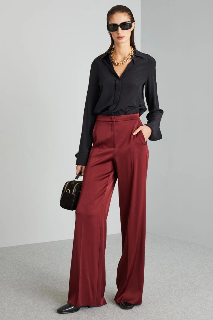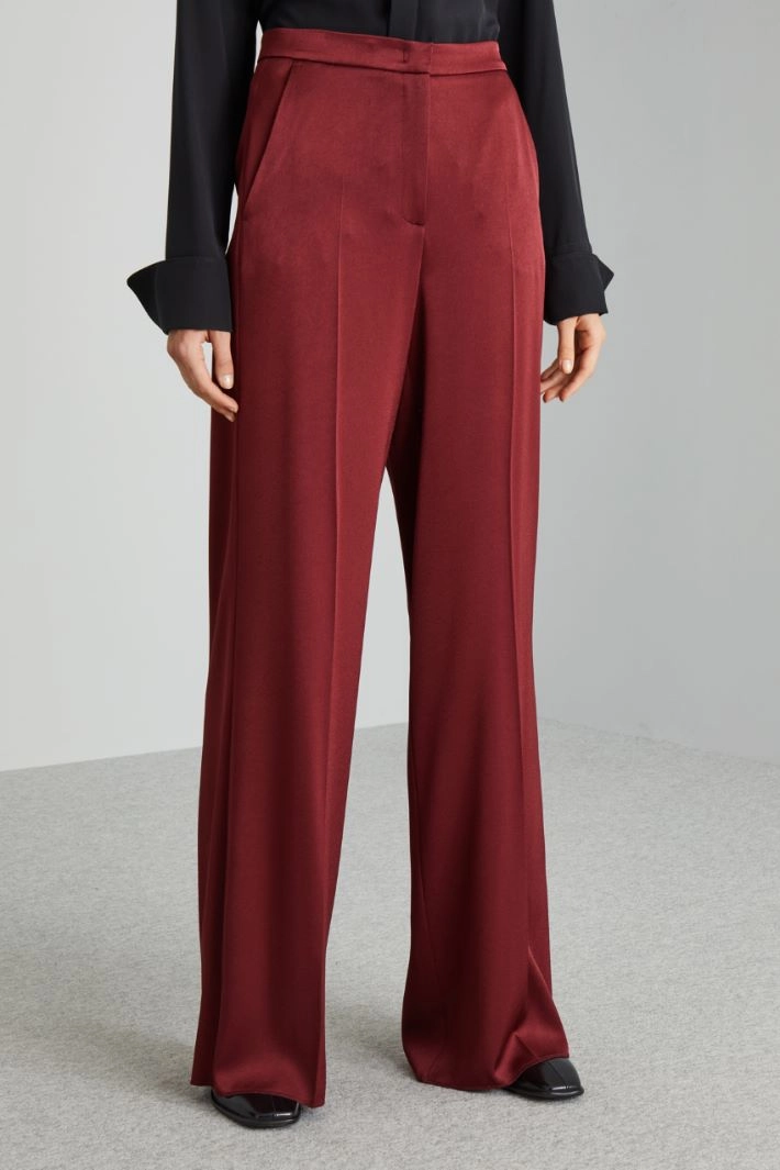 Satin palazzo trousers with side French pockets and single welt pockets on the back, pressed crease along the length and hidden fastening with zip, button and hook.